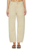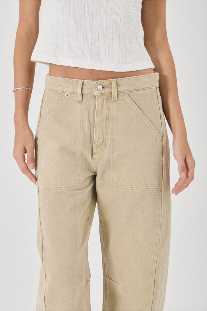 It is a mid rise relaxed fit pant, featuring a side panel and dart at the knee for a barrel leg silhouette