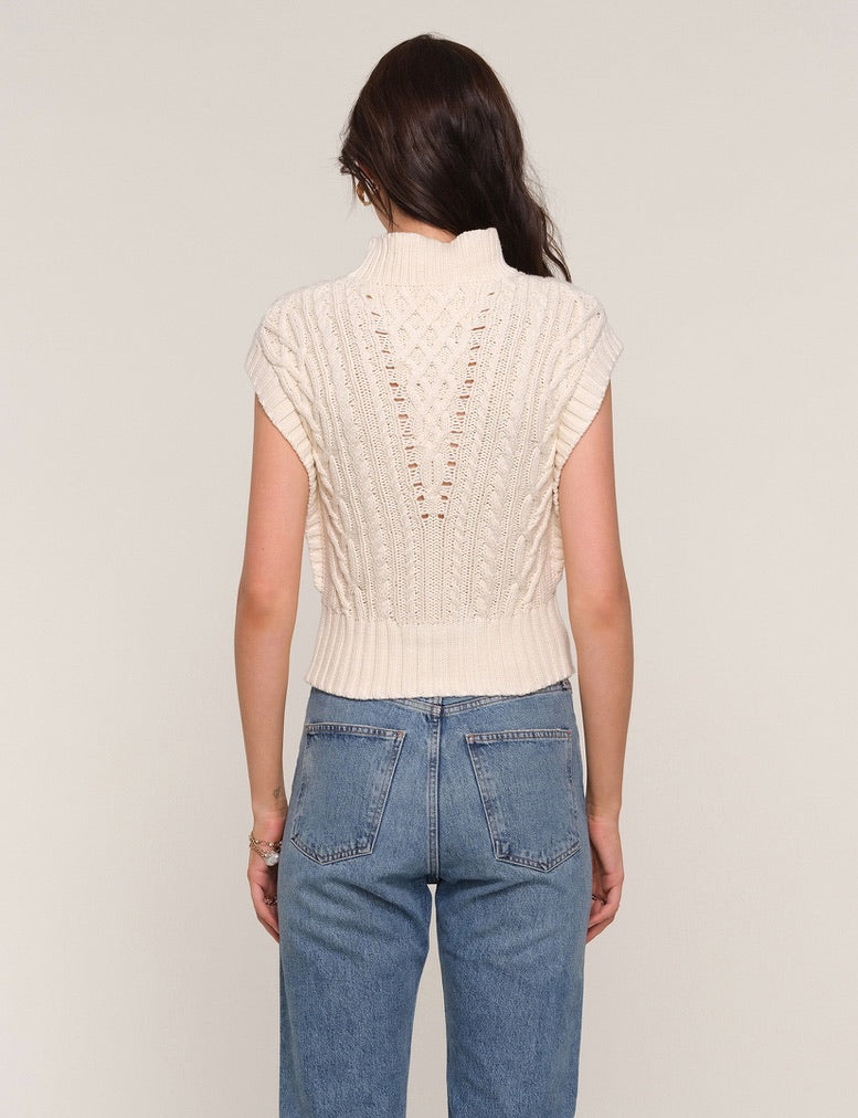 The Dove Top is a relaxed fit, sleeveless sweater with a cool, cable stitch throughout the body. It has a rib hem that skims the body and a mock neck. We love it layered over a long sleeve tee for the transitional season.