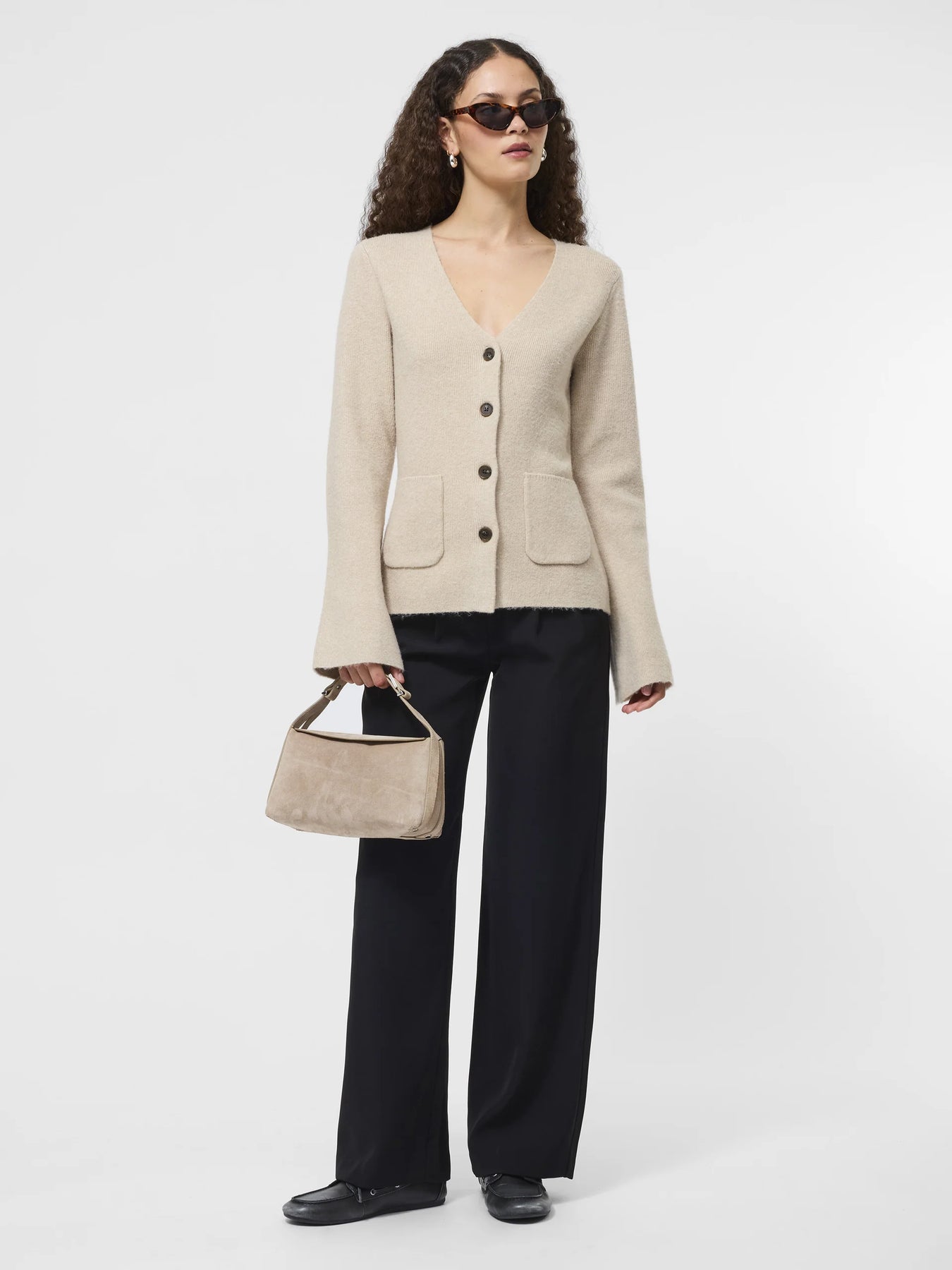 The Ellie Knit V-Neck Cardigan features a flattering deep V neckline, flared sleeves, and contrasting buttons for a little visual pop. The ribbed texture and patch pockets keep it wearable, while the shape gives just enough structure.