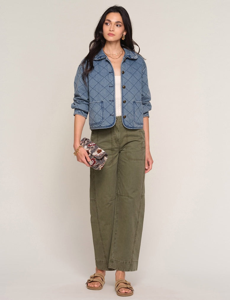 The Miller Jacket is a relaxed fit, quilted denim jacket. It features novelty buttons and a self ruffle around the collar. Throw it over any of your spring outfits.