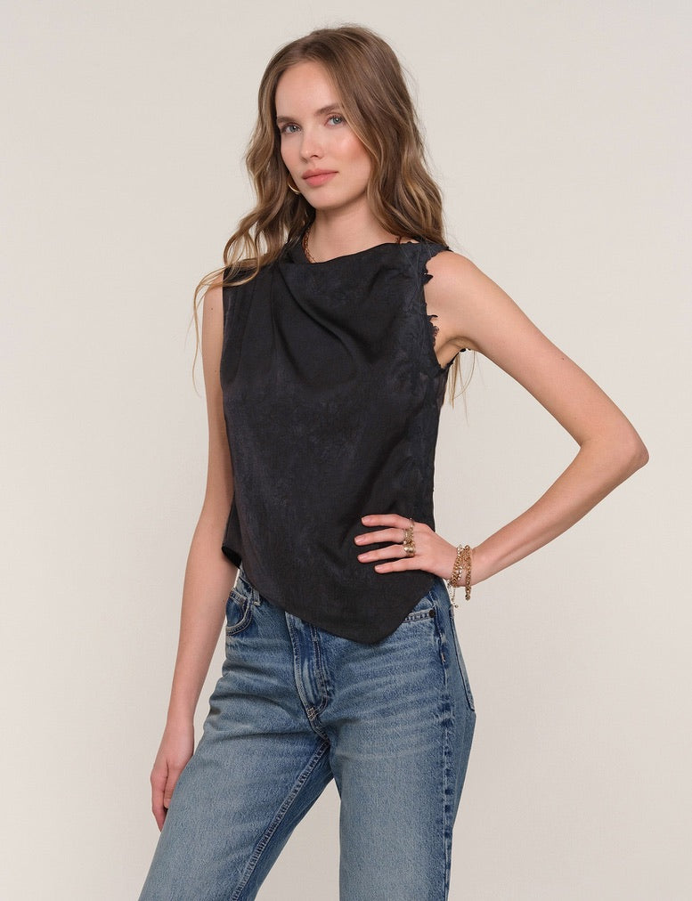 The Novia Top is made from a luxe, hammered satin. It has a draped shoulder that falls into an asymmetric hem. It features a pretty lace at the left side.