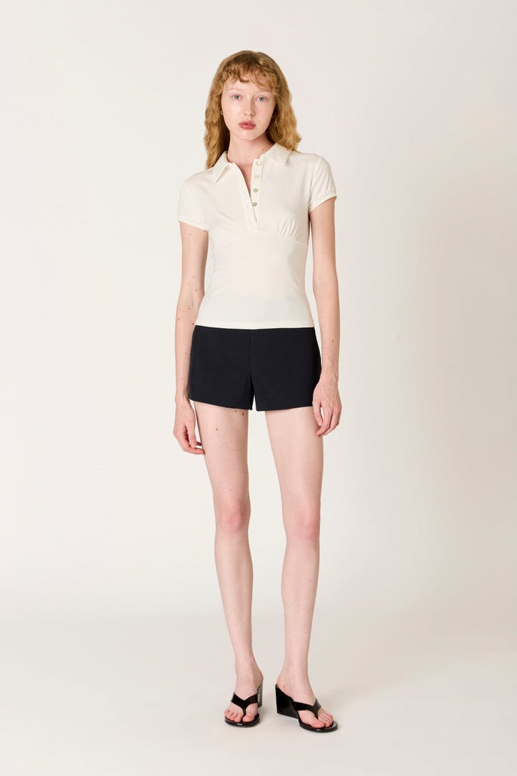 A fun and feminine take on a polo, the Quinn Top balances a classic appeal with a modern, fitted bodice. It features a traditional polo neckline and a partial button placket, updated with gentle shaping under the bust for a more tailored silhouette. The short, fitted sleeves and unlined construction keep the profile sleek and light, making it a versatile choice for everyday wear.