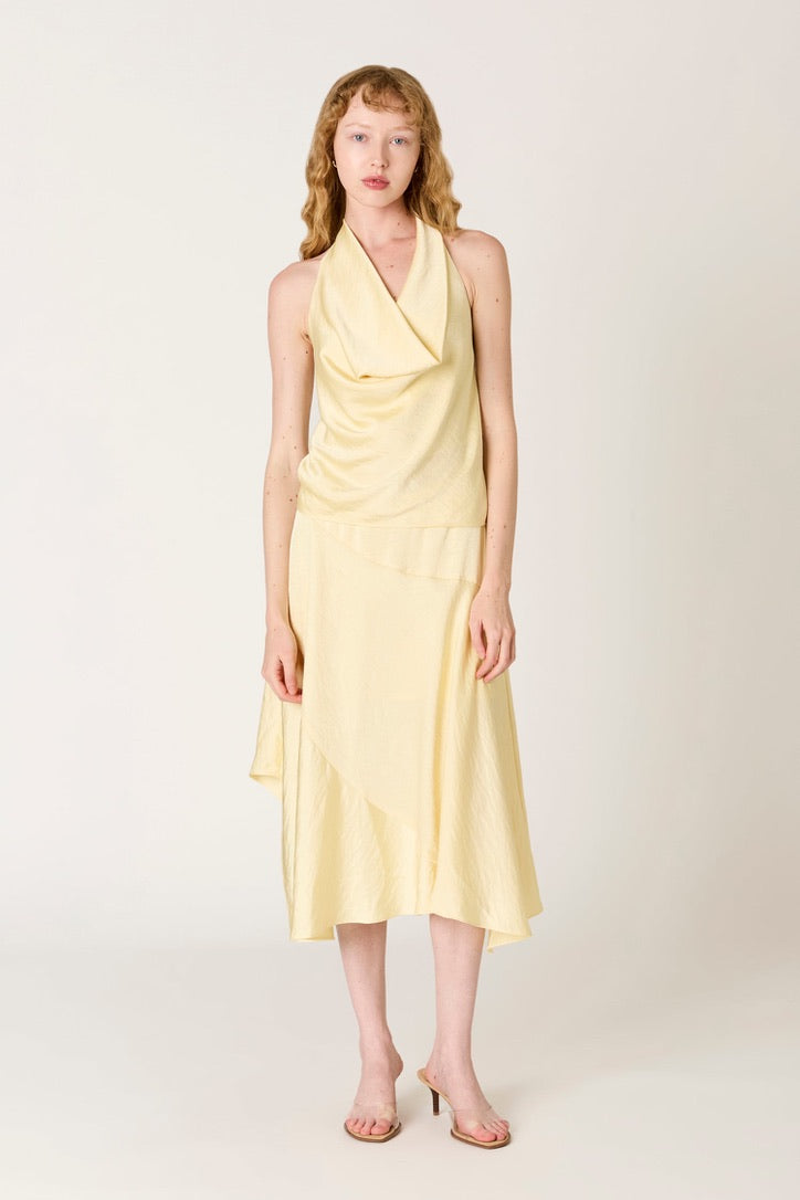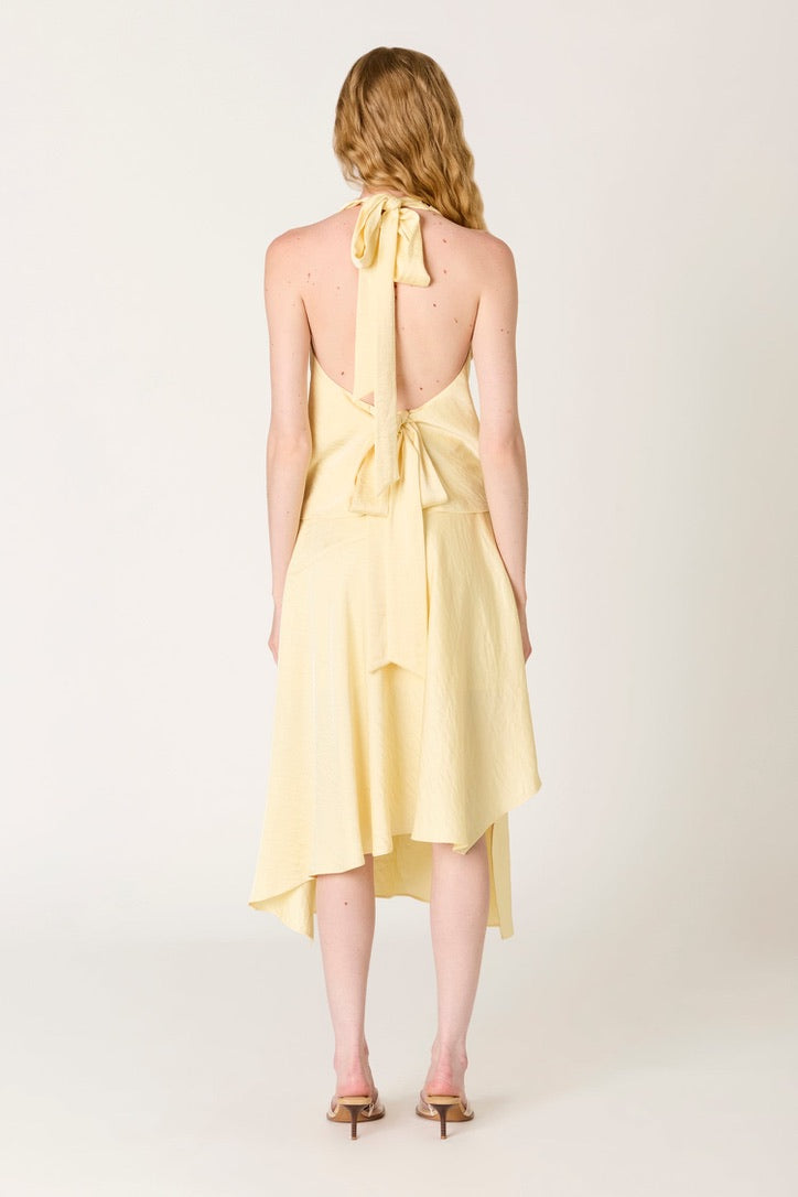 Offering a relaxed yet refined fit, the Solana Top is centered by a draped cowl halter neckline that captures a sense of composed ease. The open back serves as a striking focal point, featuring adjustable self-tie straps at the neck and a secondary mid-back tie for a customizable, secure fit.
