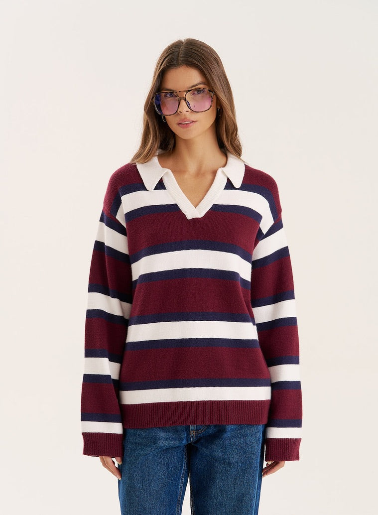 Designed for versatile styling, the Tommie jumper is designed to be worn and loved through the season's transition. In an ultra-soft knit with a ribbed hem and sleeve cuffs, it's endlessly cosy while bringing preppy-chic sophistication to your wardrobe. Featuring a bold burgundy, navy and white stripe and contrast collar, make the jumper the outfit's statement with jeans and simple jewelry.