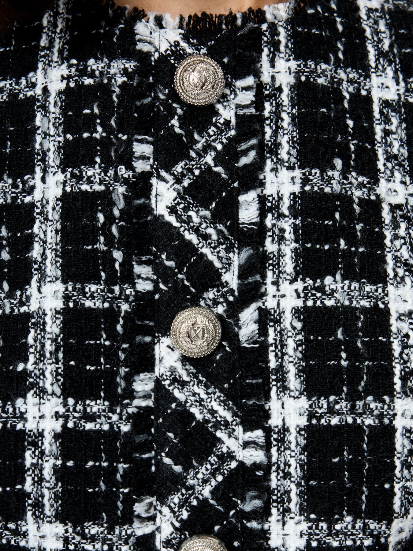 Sharp lines meet modern polish. The Windowpane Tweed Crop Top is tailored in a textured black & white tweed with bold buttons and a sleeveless silhouette. Cropped to the waist for a clean finish, it’s an elevated separate that works perfectly with its matching skirt—or just as effortlessly with denim.