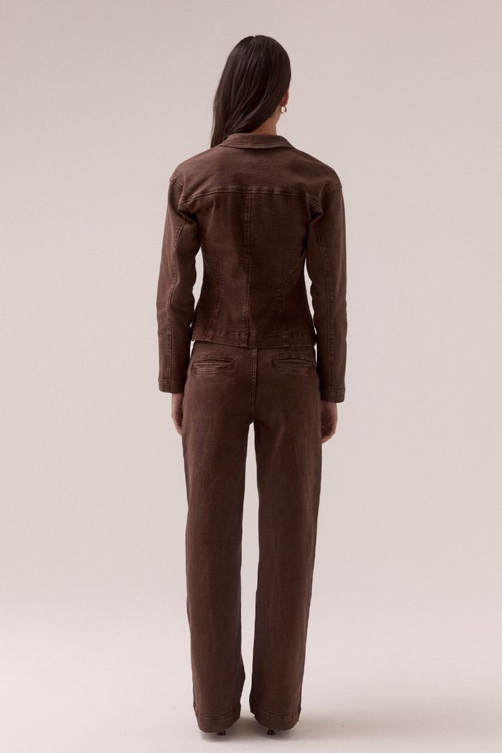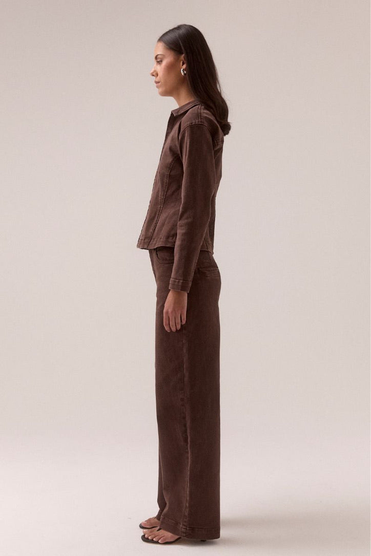- Stretch Denim fabrication- Cinched waist shirt- Dropped shoulder- Long sleeve with cuff- Two piece collar- Body shaping panels- Hook & eye closure at front